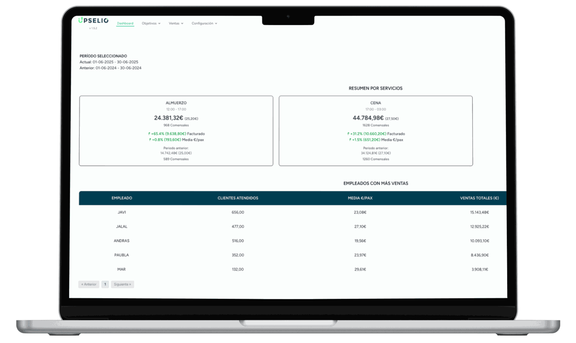 Compara objetivos por empleado y decide dónde reforzar e impulsar las ventas. Upselio te muestra quién vende más, qué funciona mejor y cómo evoluciona tu equipo.